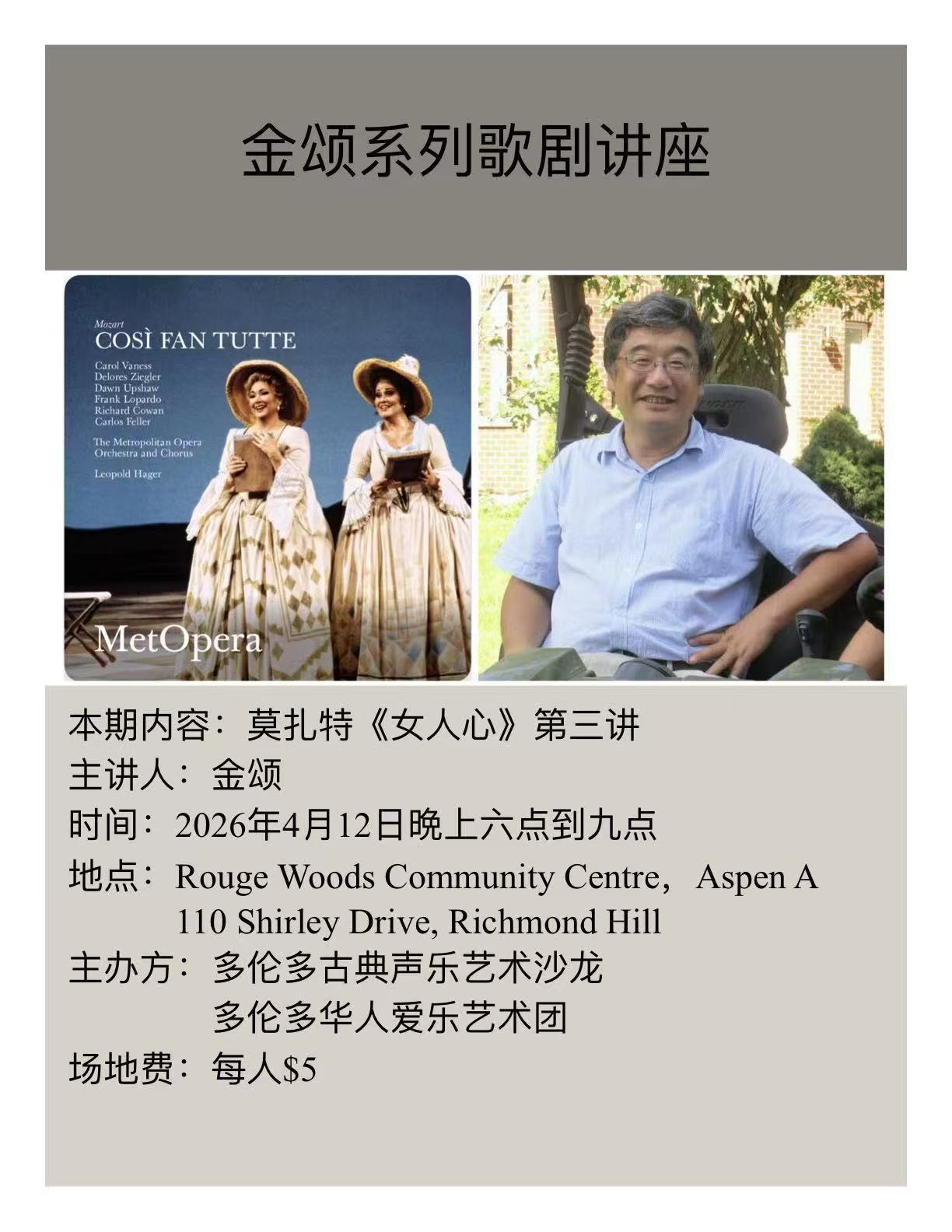 2026年4月12日(周日)晚6:00-9:00金颂系列歌剧讲座-莫扎特《女人心》第三讲