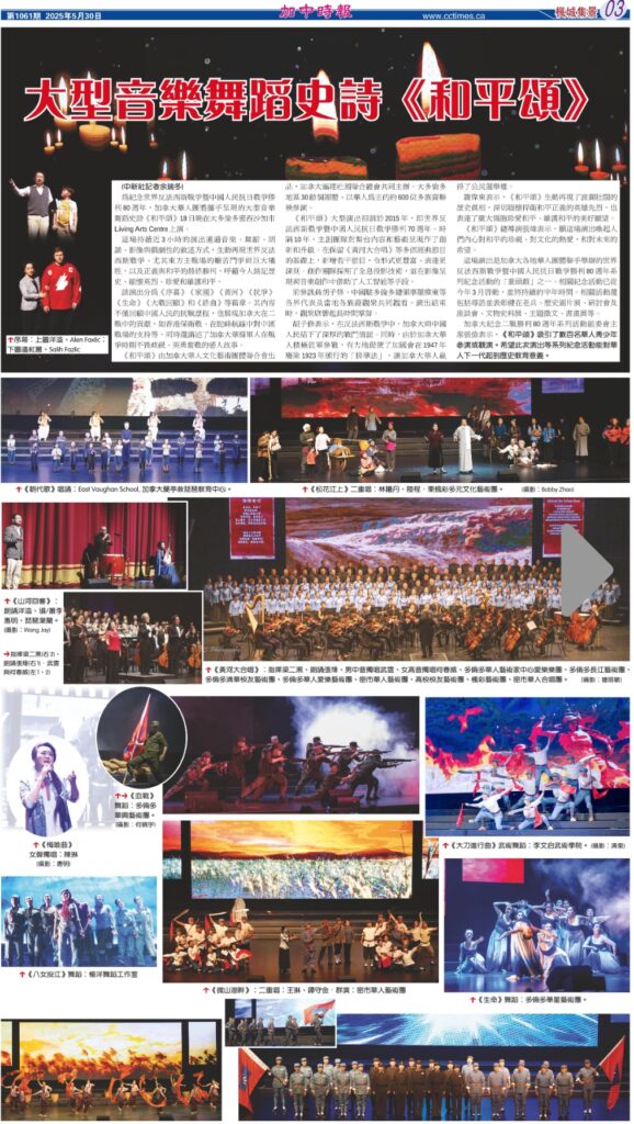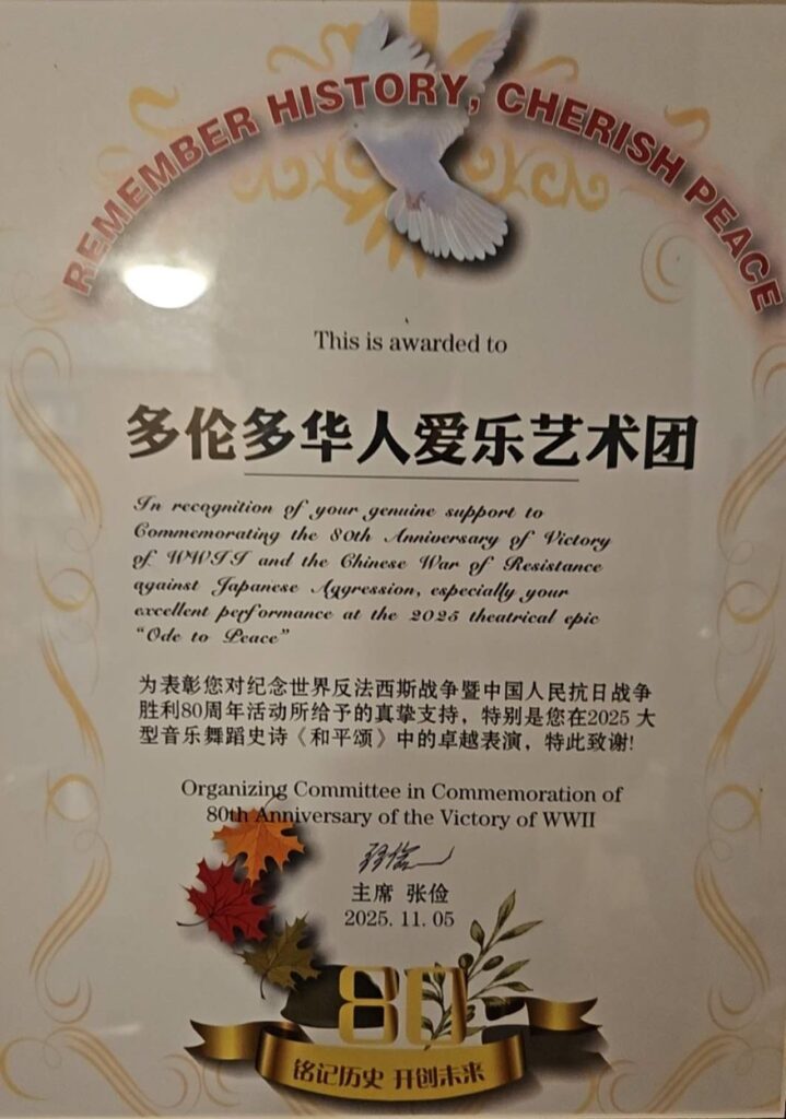 多伦多华人爱乐艺术团于2025年5月18日在密西沙加市Living Arts CTR参加加拿大纪念抗战80周年的大型音乐舞蹈史诗“和平颂-黄河大合唱”演出。多伦多华人爱乐艺术团与其它合唱团一起共200人共同演绎了气势磅礴的《黄河大合唱》的四个乐章:《黄河船夫曲》《黄水谣》《保卫黄河》《怒吼吧,黄河》。